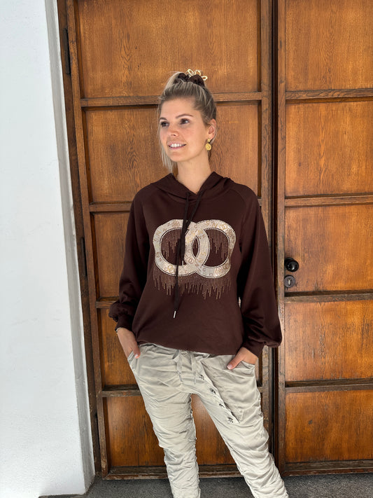 Pullover in Schokobraun mit Kapuze und goldenen Glitzeraufdruck
