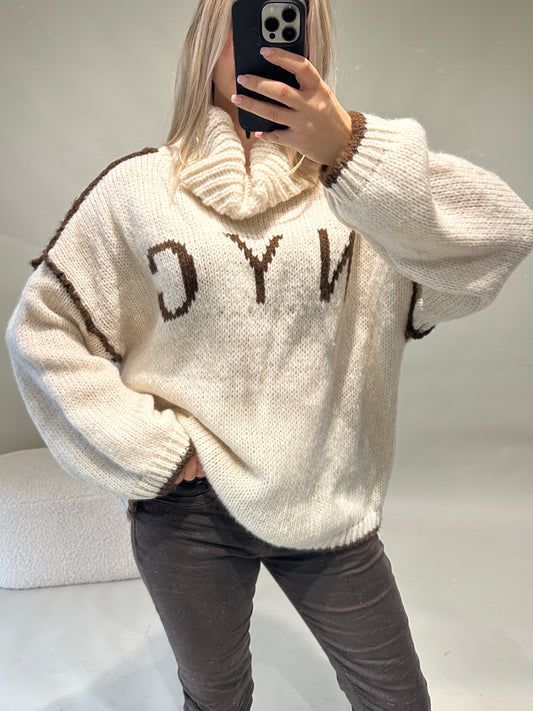 Pullover in Sand mit Schokobrauner Aufschrift (NYC) und weitem Rollkragen