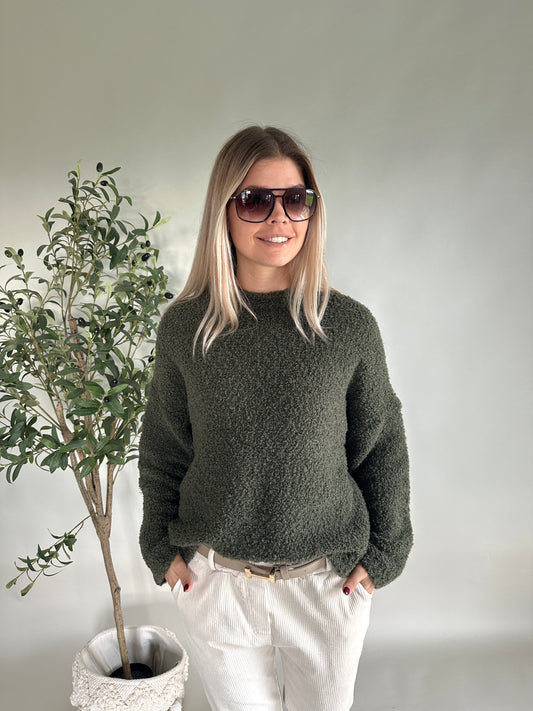 Pullover in Olivgrün mit Aufschrift in Wollweiß