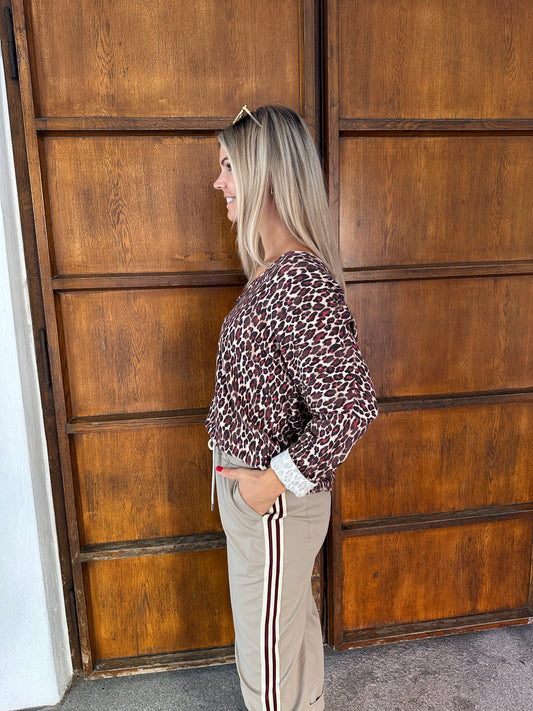 Shirt mit Leo-Muster in Beige/Weinrot/Schwarz und V-Ausschnitt