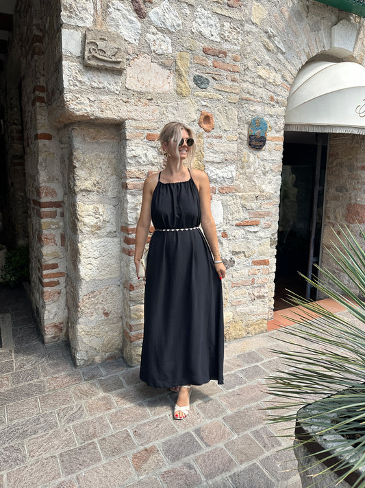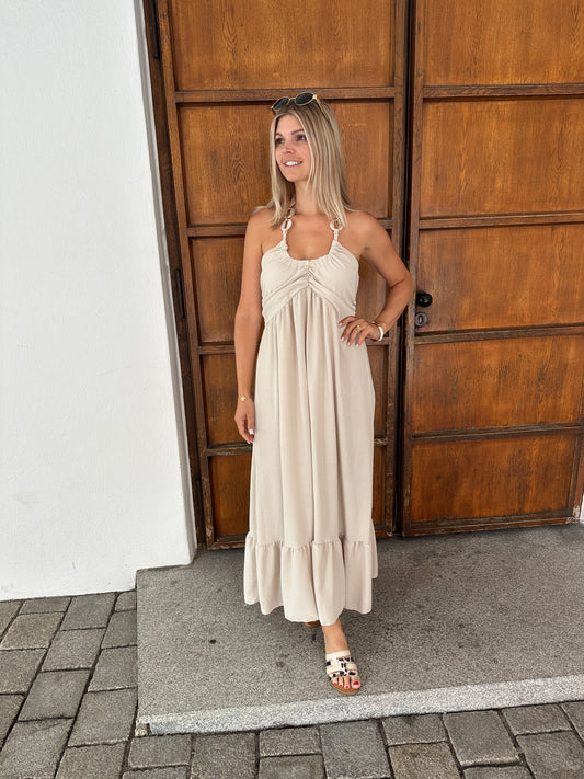 Kleid in Beige (Neckholder) mit Perlmutt-Schmuck vorne