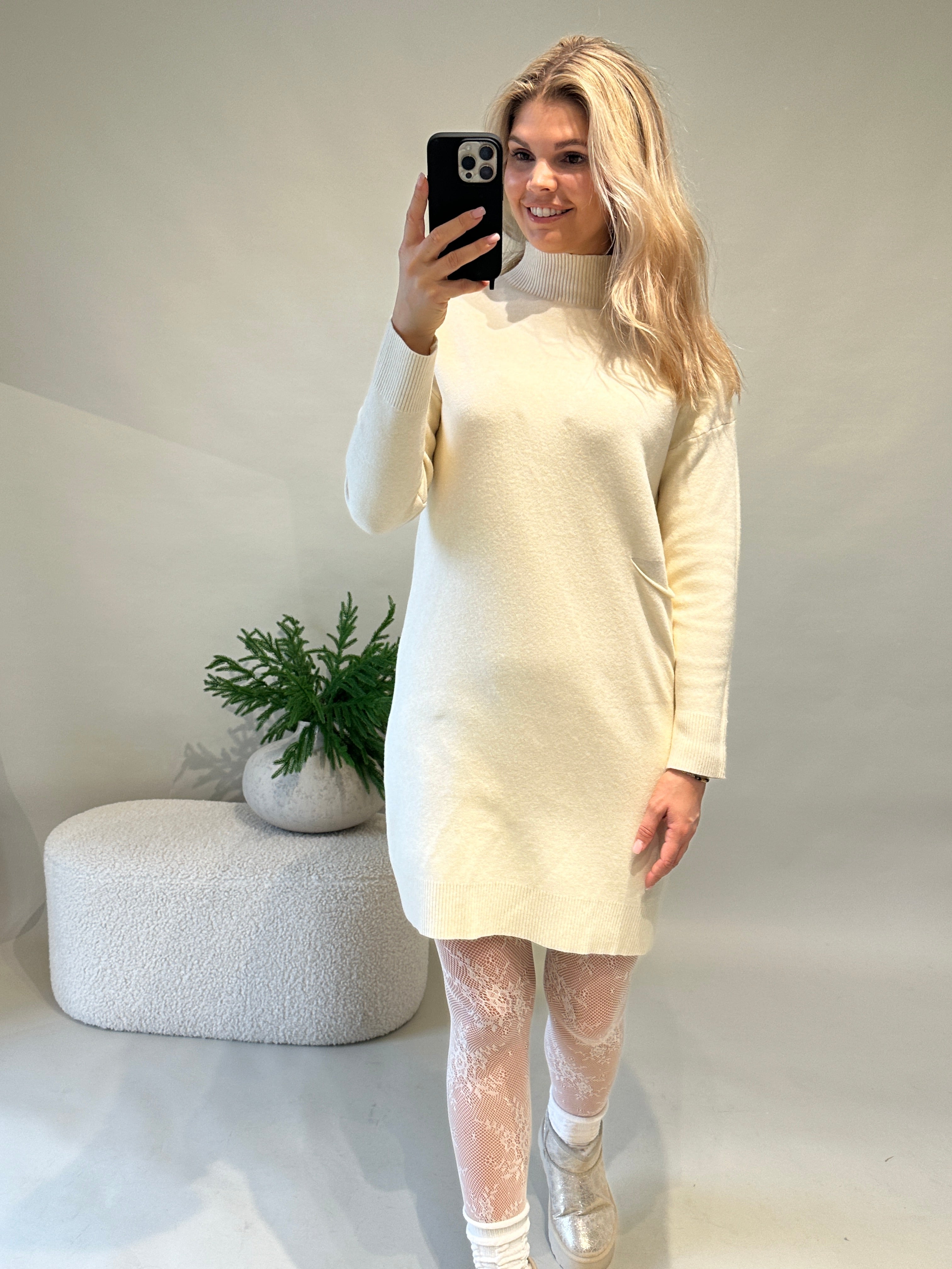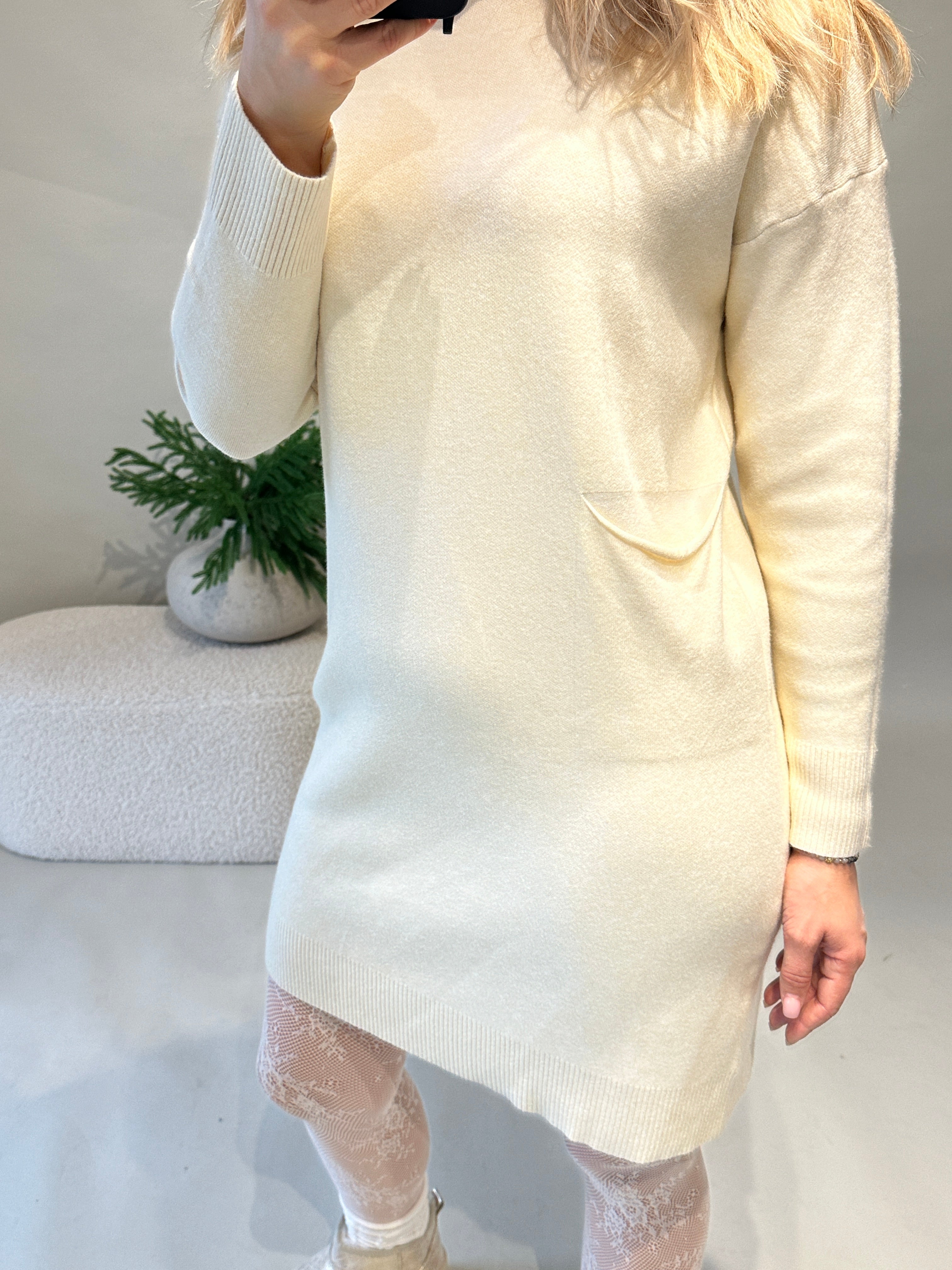 Strickkleid in Wollweiß mit kleiner Tasche vorne