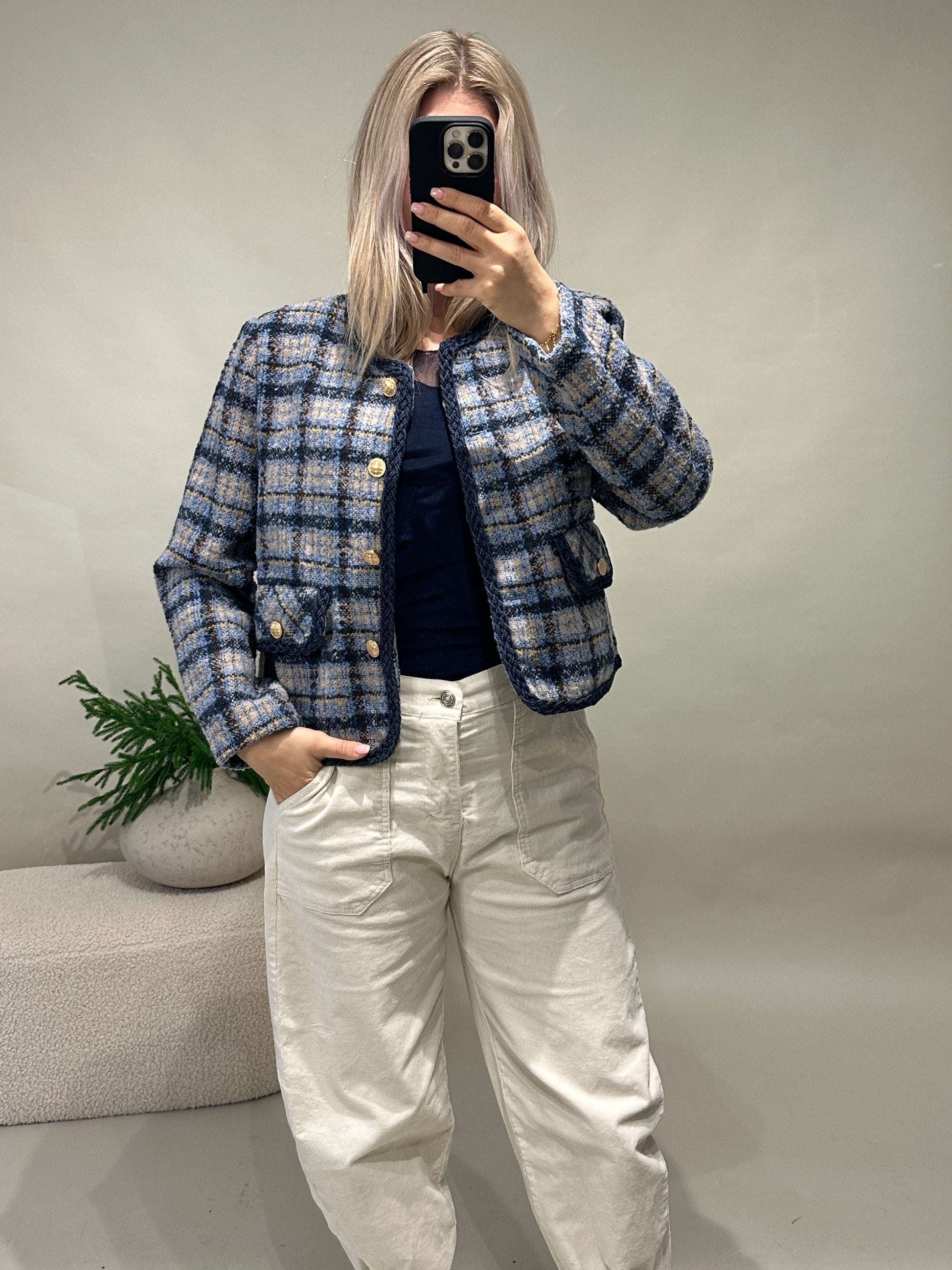 Jacke in Blau/Wollweiß/Schokobraun (Boucle) kariert mit Goldenen Knöpfen