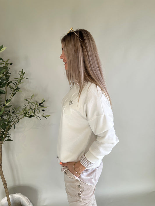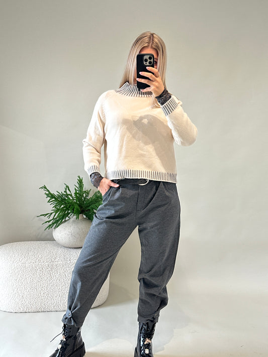 Pullover in Wollweiß mit Grauen Streifen an Bund und Kragen