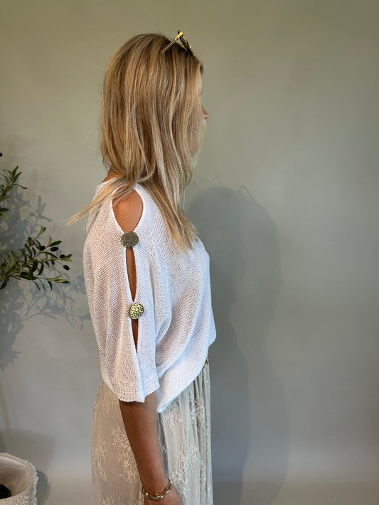 Pullover mit Öffnungen und goldene Knöpfe am Arm in Weiß