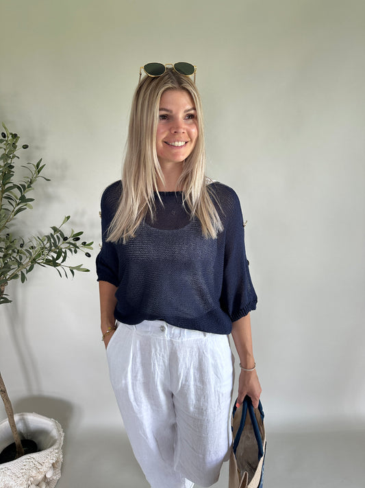 Pullover mit Öffnungen und goldene Knöpfen am Arm in Dunkelblau