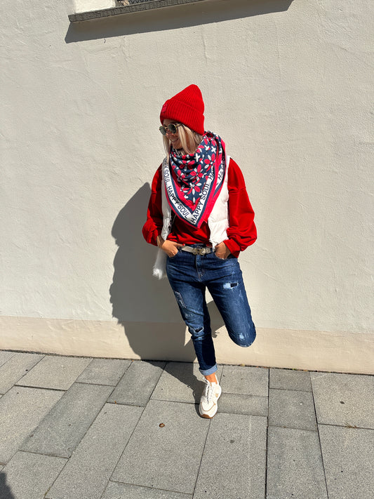 Schal in Zimt/Schwarz/Wollweiß mit Aufschrift