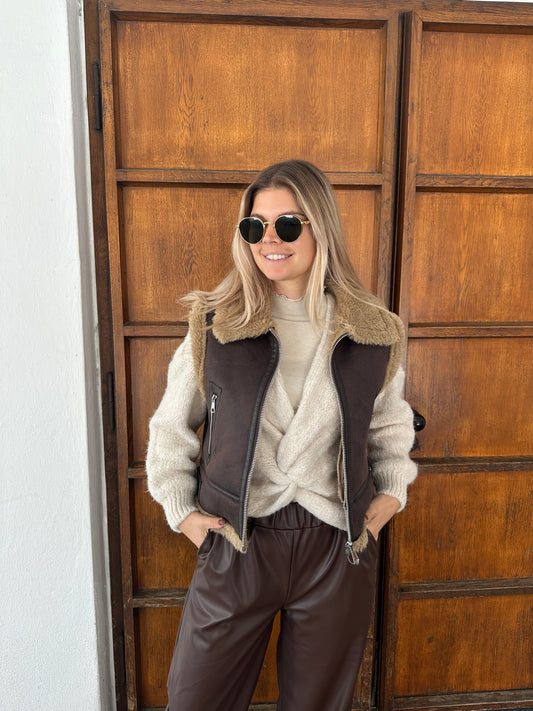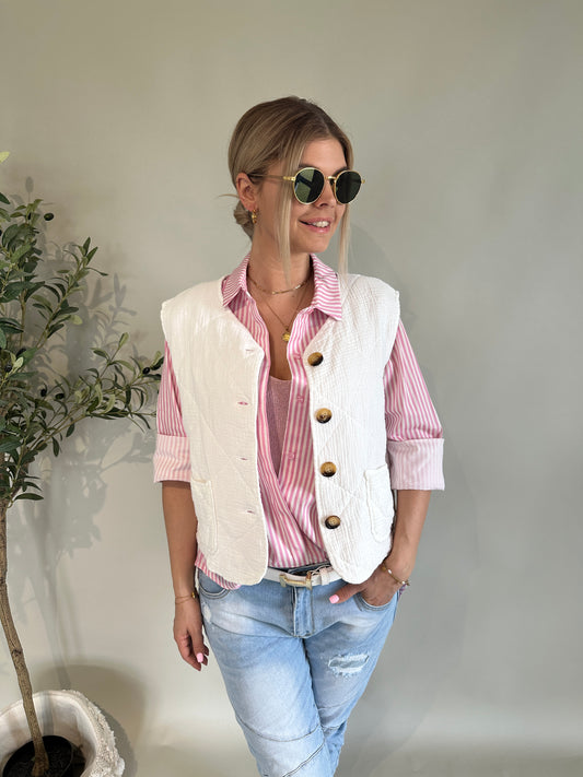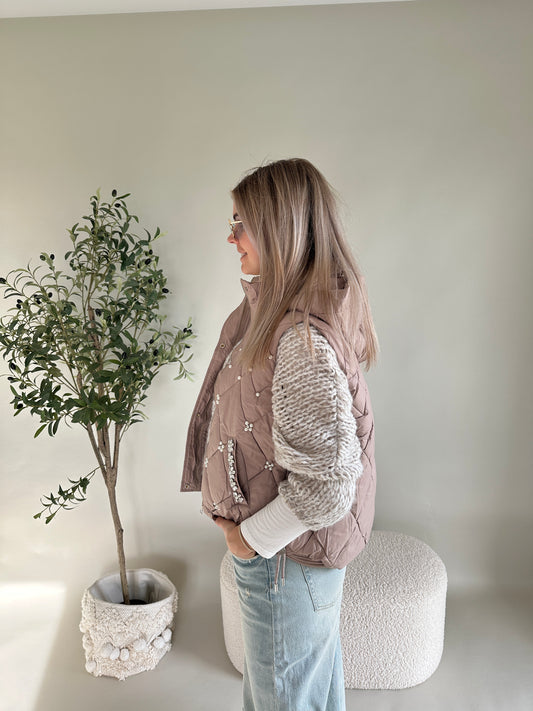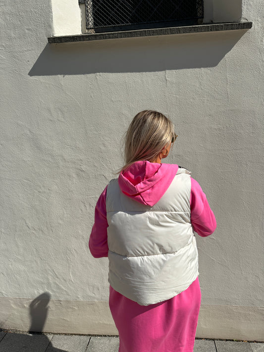 Steppweste in Beige ärmelos mit Kapuze und Perlen vorne