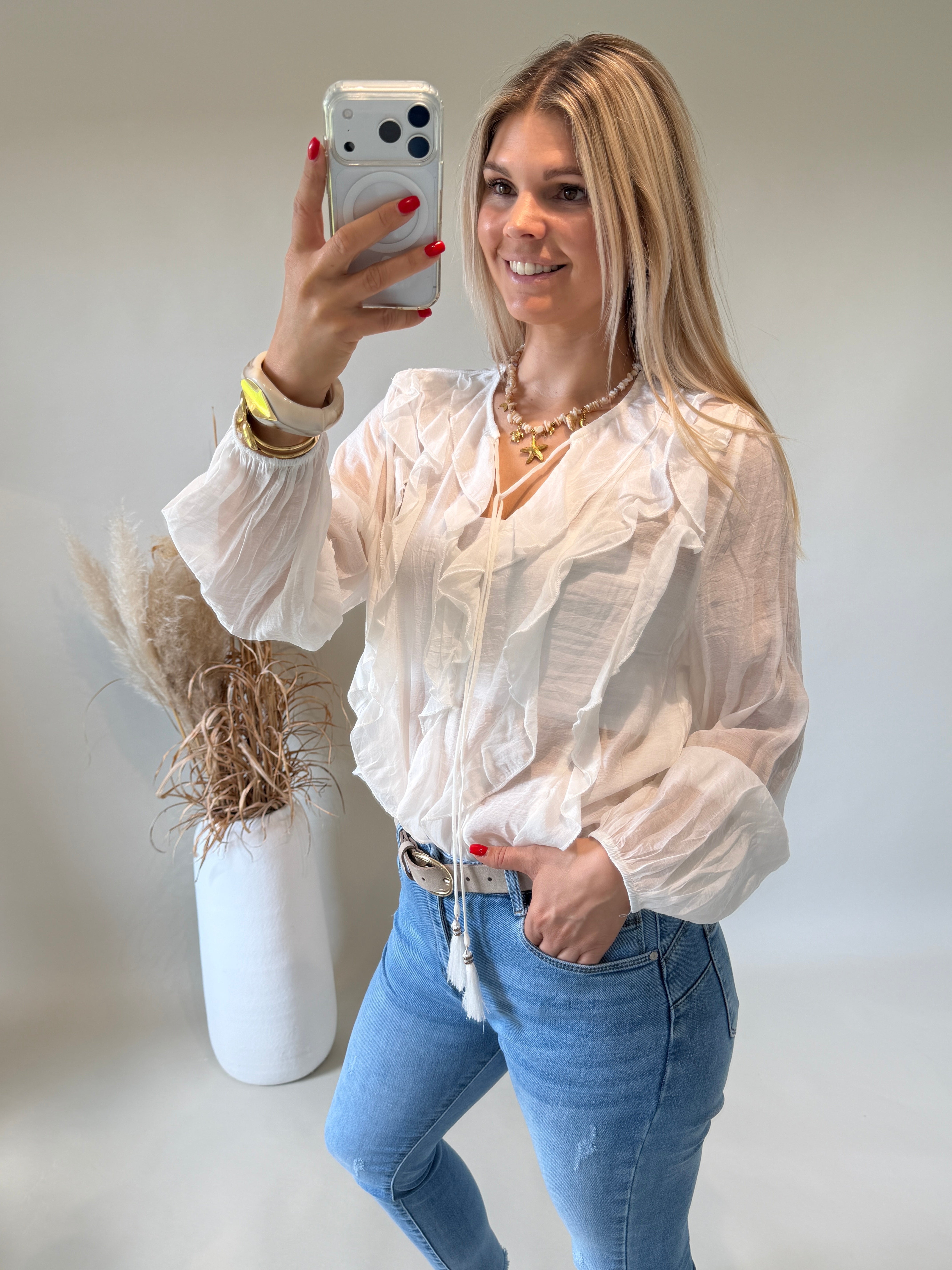 Bluse in Weiß mit Rüschen und Kordel vorne