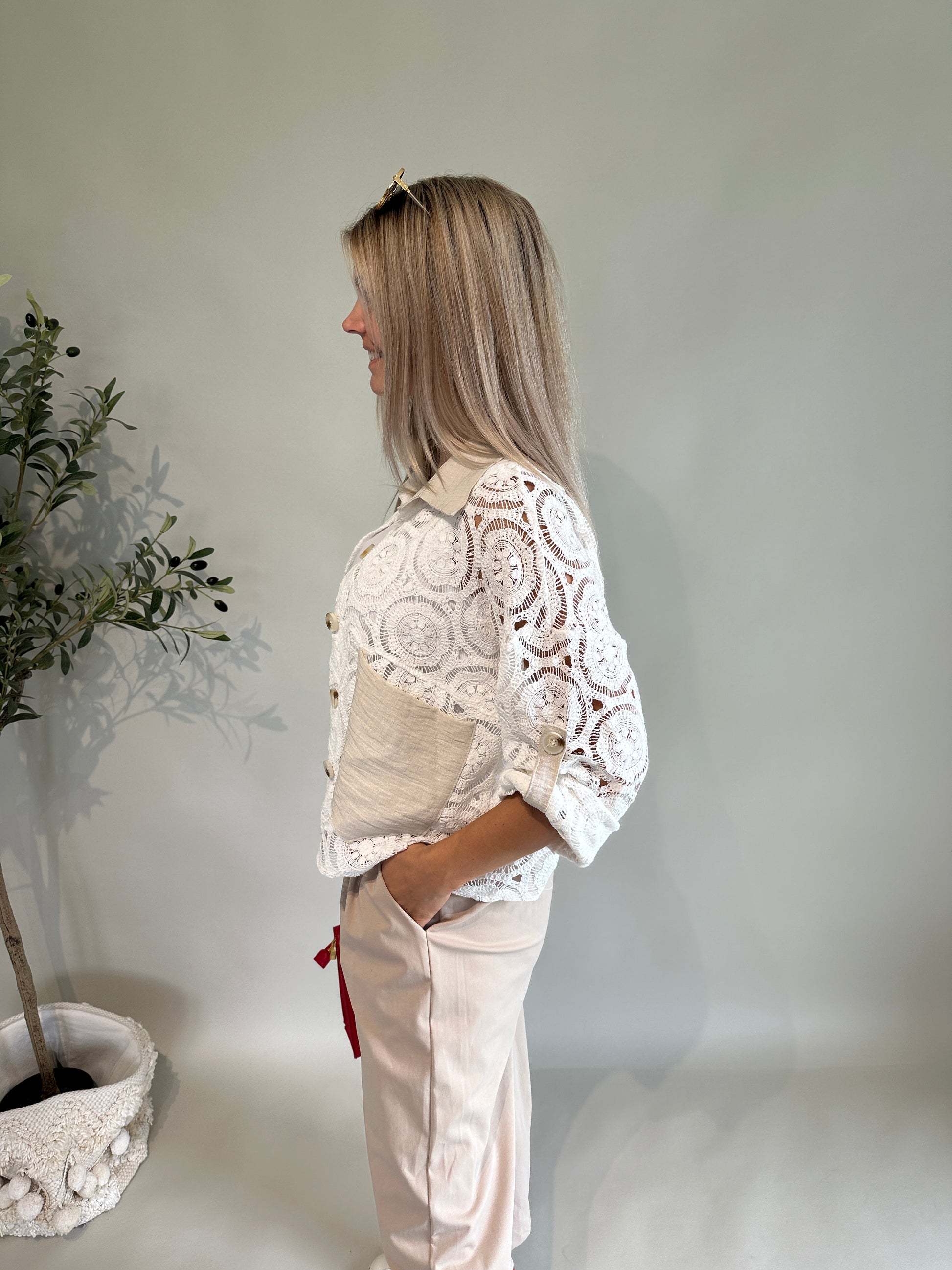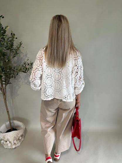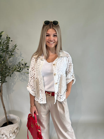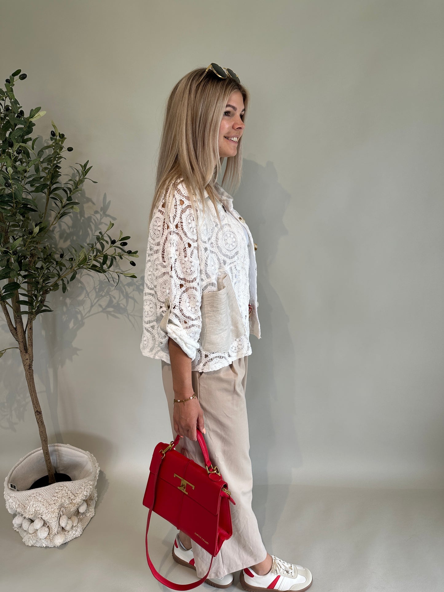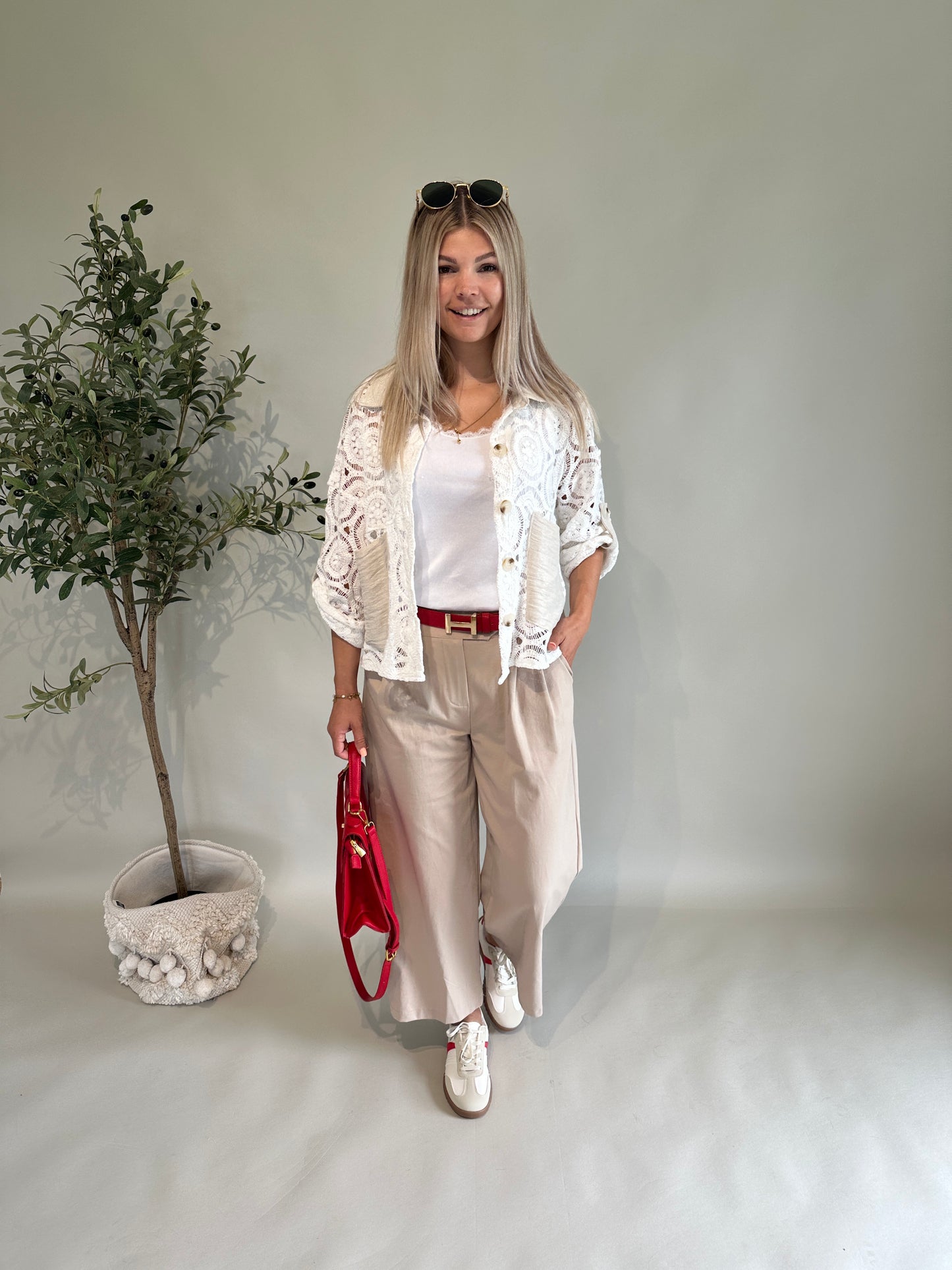Jacke mit Lochmuster( Häkeloptik) und großen Taschen vorne in Hellbeige