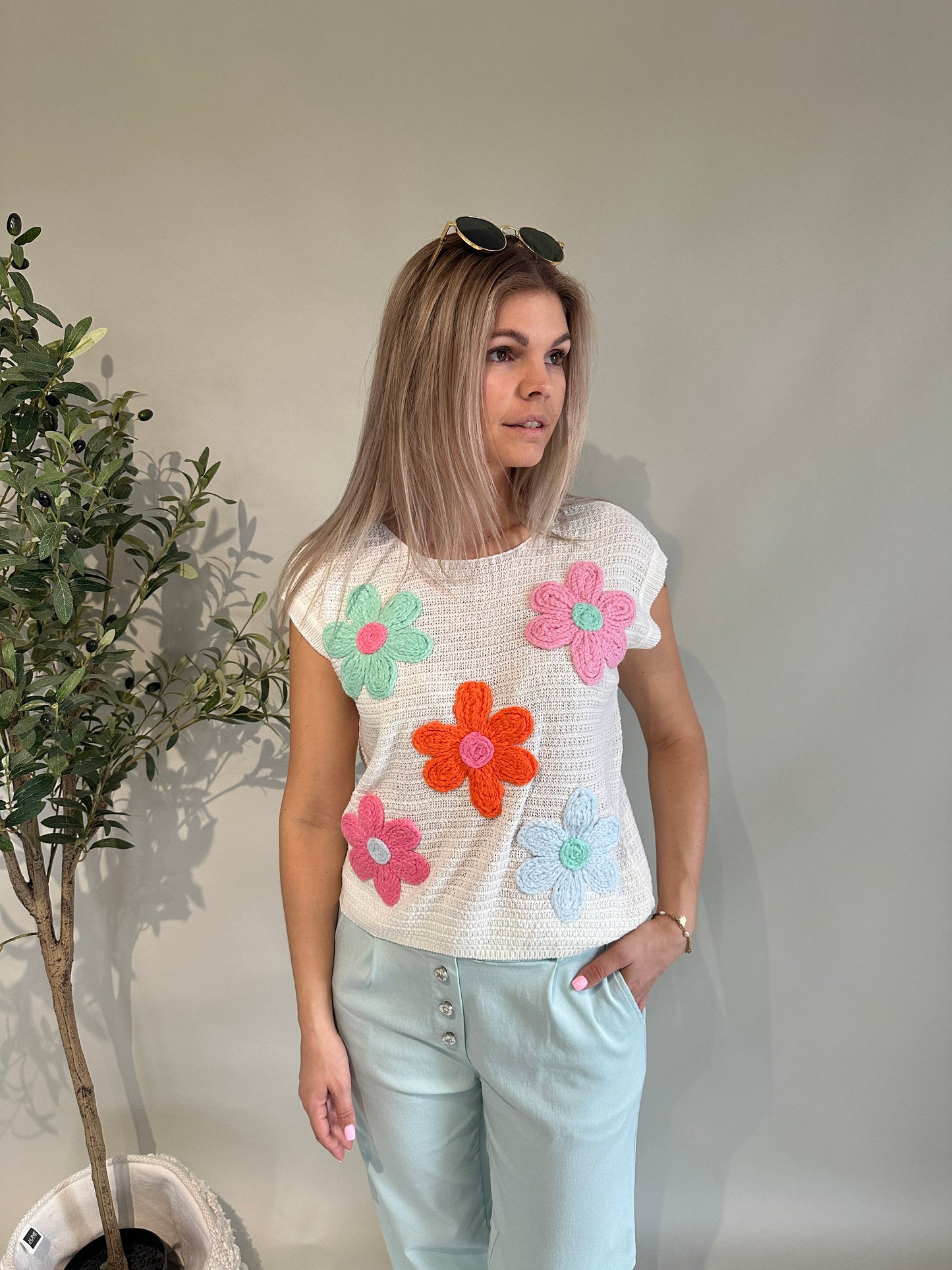 Pullover ärmellos in Weiß mit bunten Blumen
