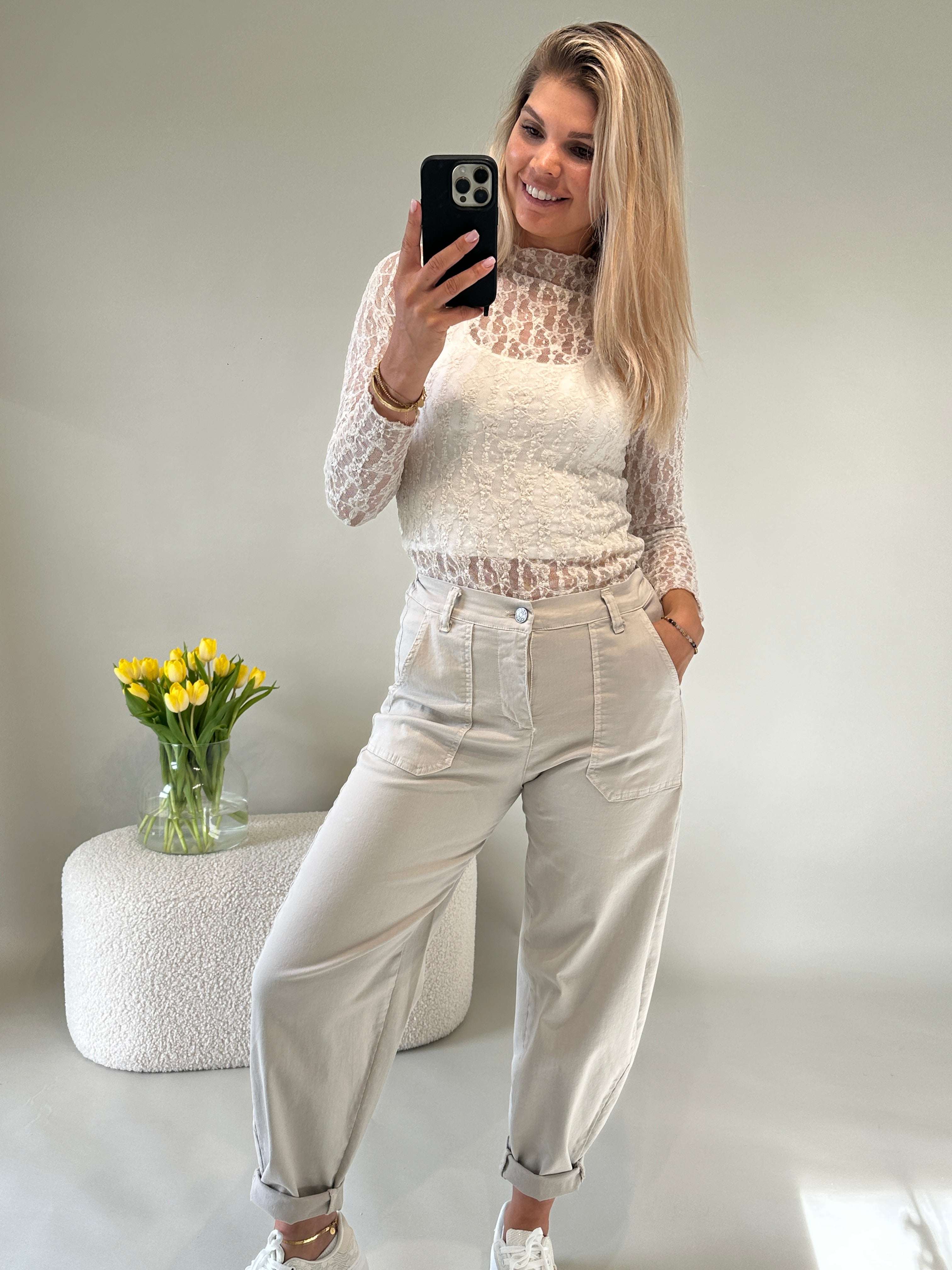 Spitzenshirt in Hellbeige mit kleinen Stehkragen