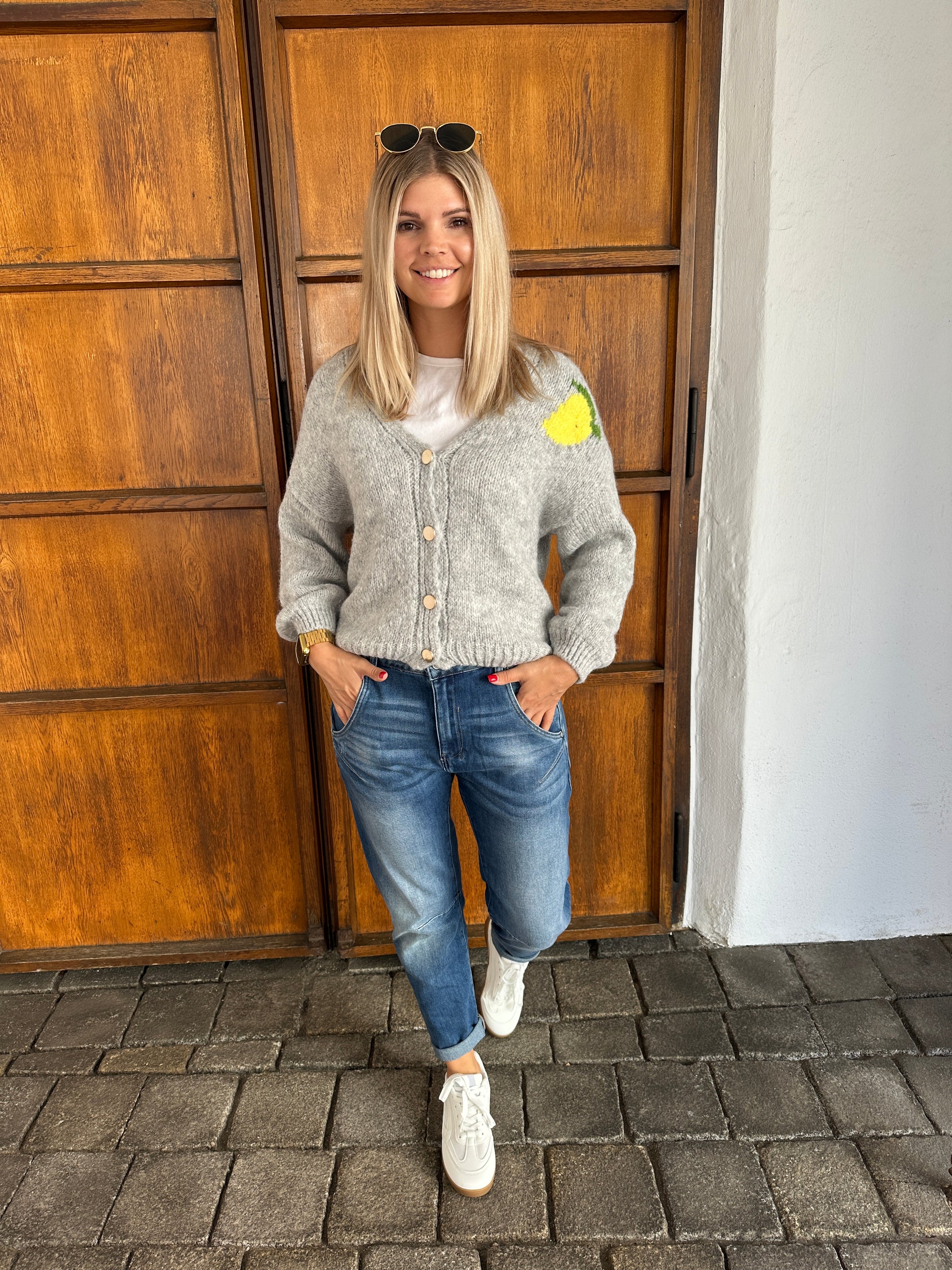 Strickjacke in Hellgrau mit Zitronen -Applikation vorne und hinten